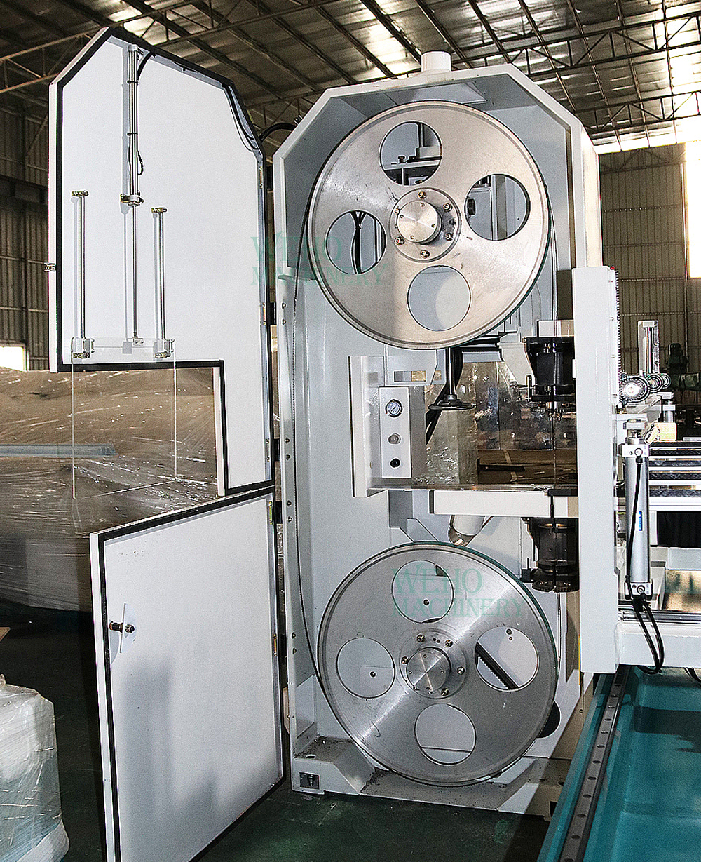 آلة منشار شريطي عمودي CNC للنجارة. مشبك قوي لدفع قطع العمل. باب أمان لمنع الحوادث. عجلة من الألومنيوم المصبوب.