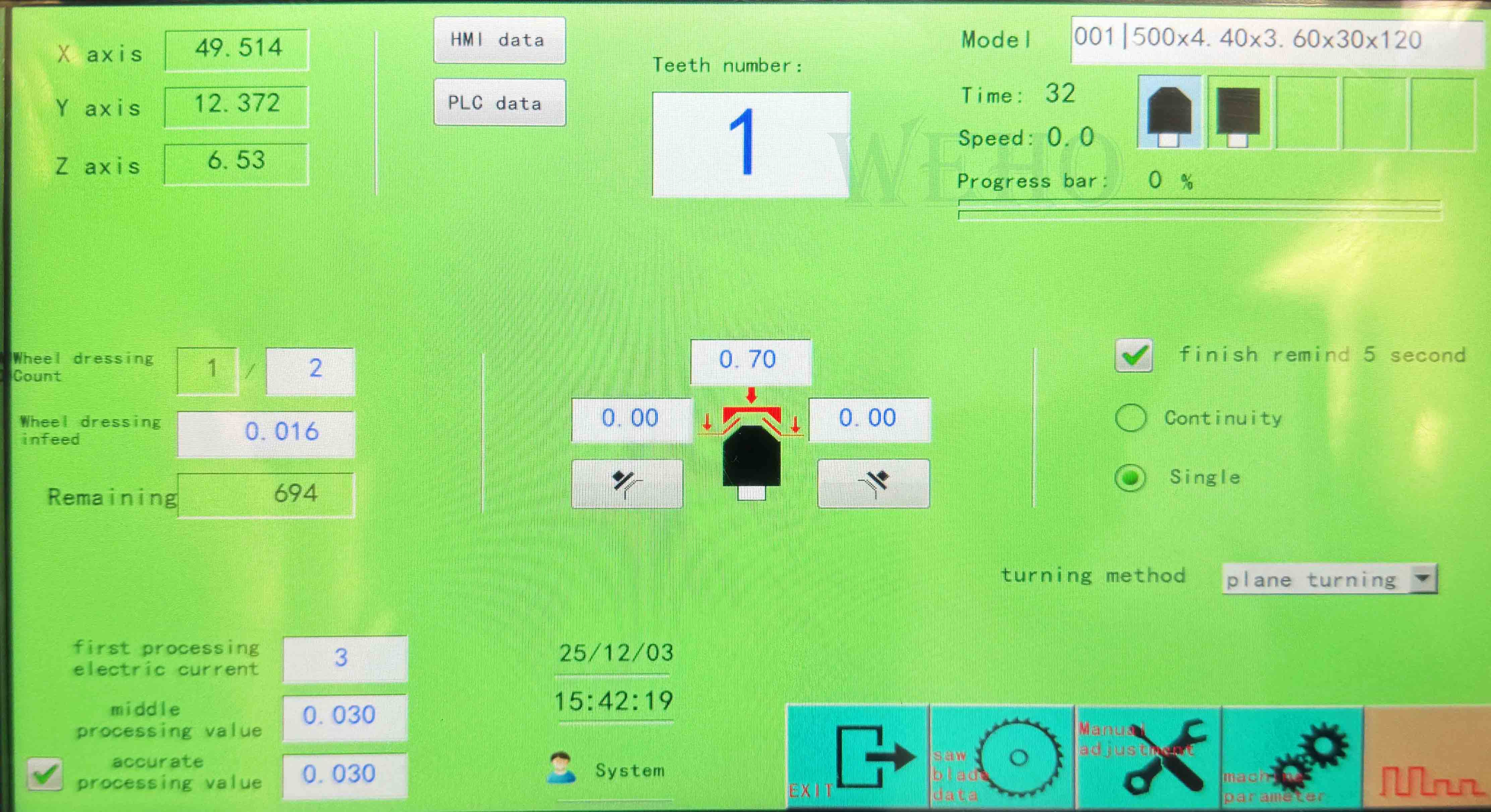 أثناء عملية التشغيل، يمكن ضبط فقدان عجلة الإلكترود مسبقًا، وإعادة إجراء تعويض الدوران أثناء عملية التشغيل، لتجنب عدم دقة التشغيل الناتجة عن فقدان الإلكترود. تتميز عملية التشغيل بالسهولة والسرعة، كما أنها تُحسّن دقة إنتاج شفرات المنشار بشكل فعال، ويمكن إتمام عملية معالجة الأدوات متعددة الأسنان تلقائيًا دون تدخل بشري.