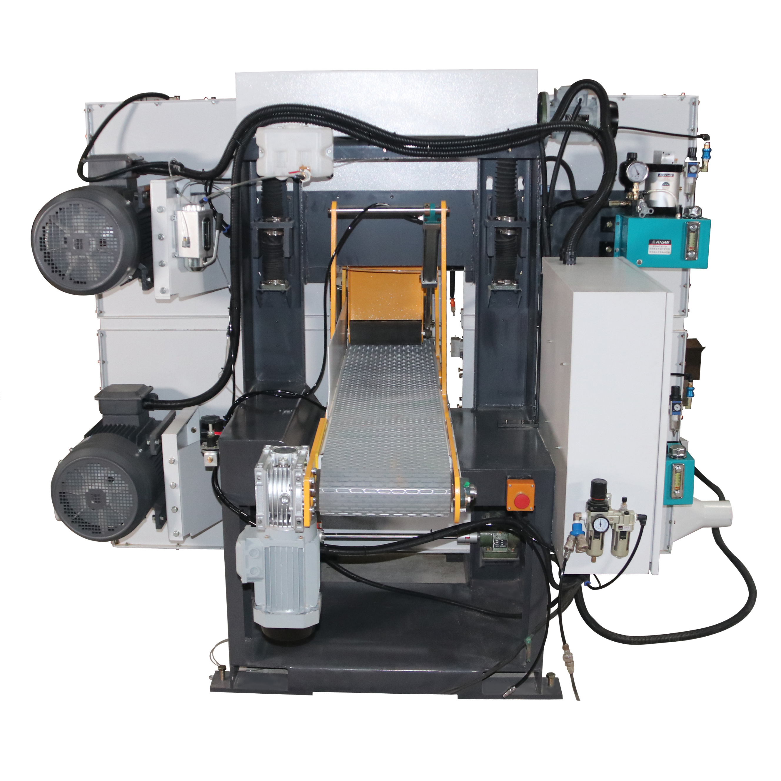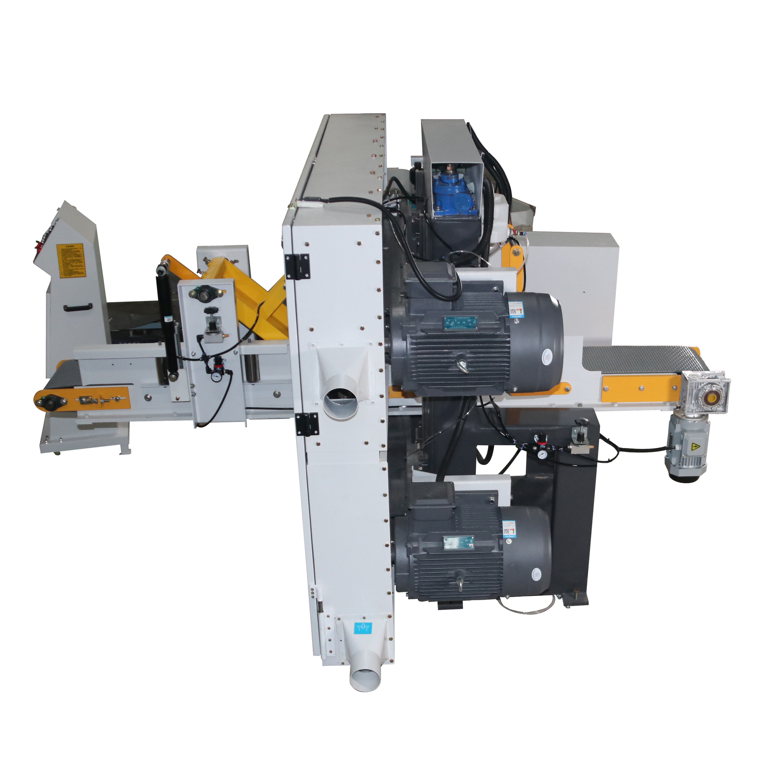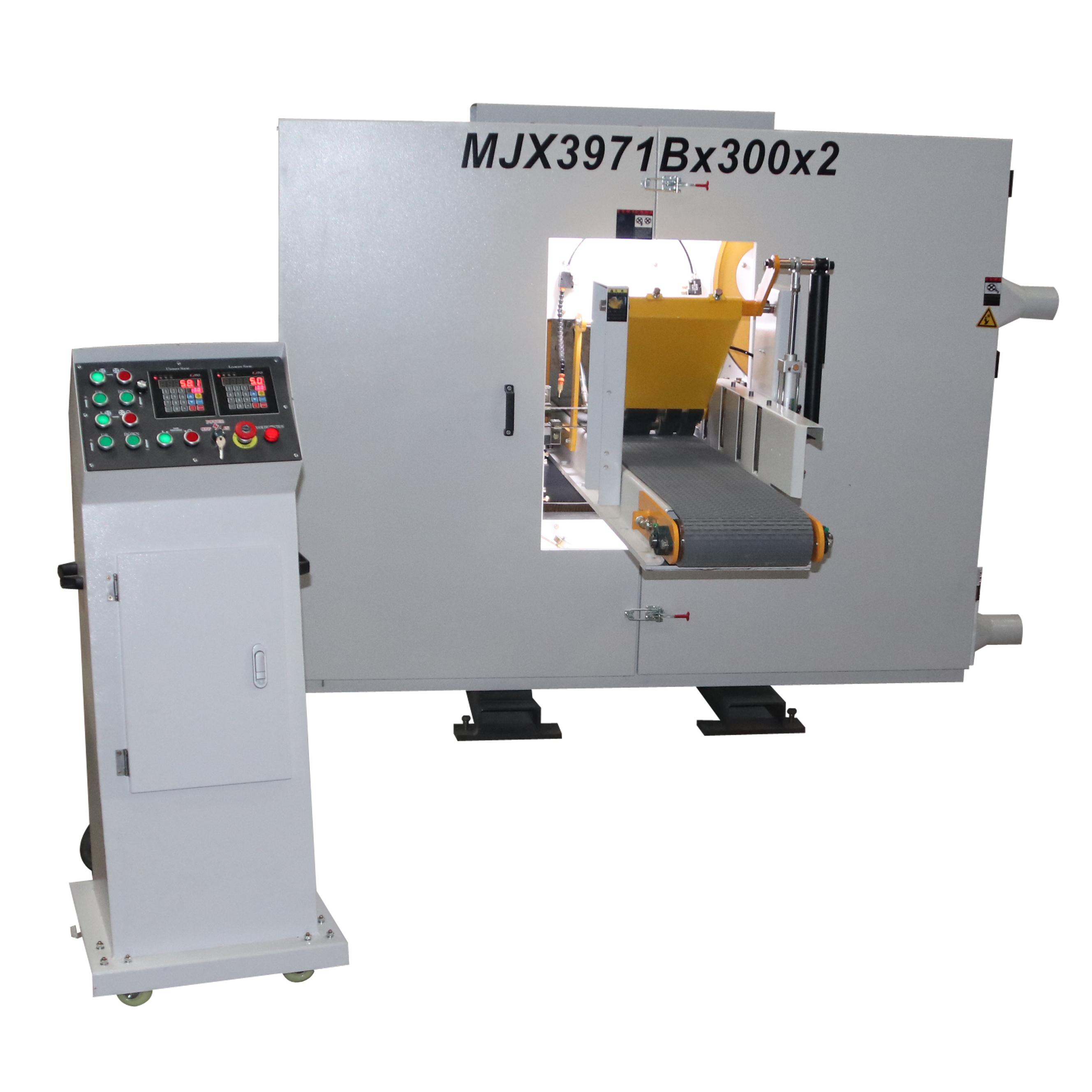 آلة منشار شريطي أفقي برأسين مزدوجين لأعلى ولأسفل لقطع الخشب مع وحدتي منشار