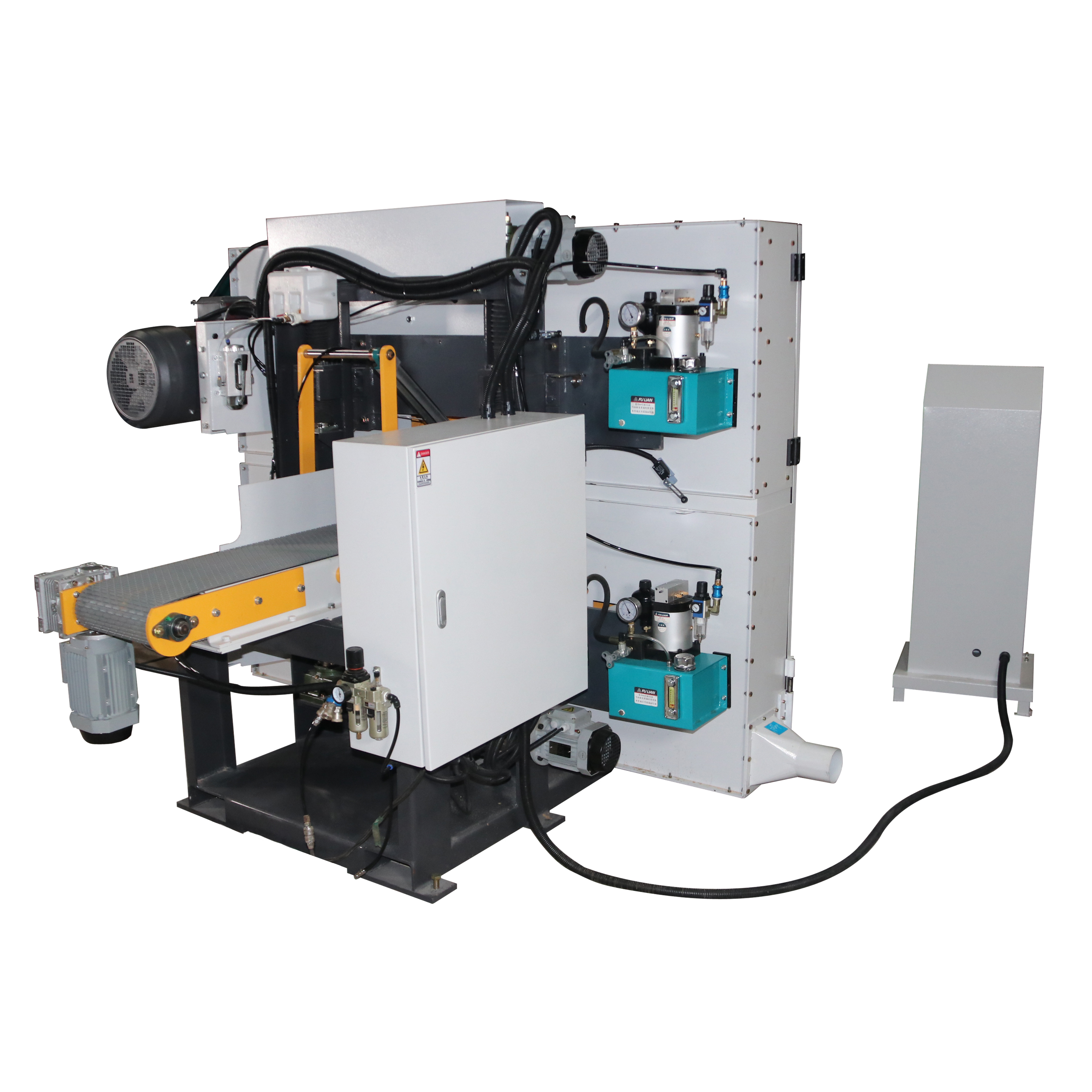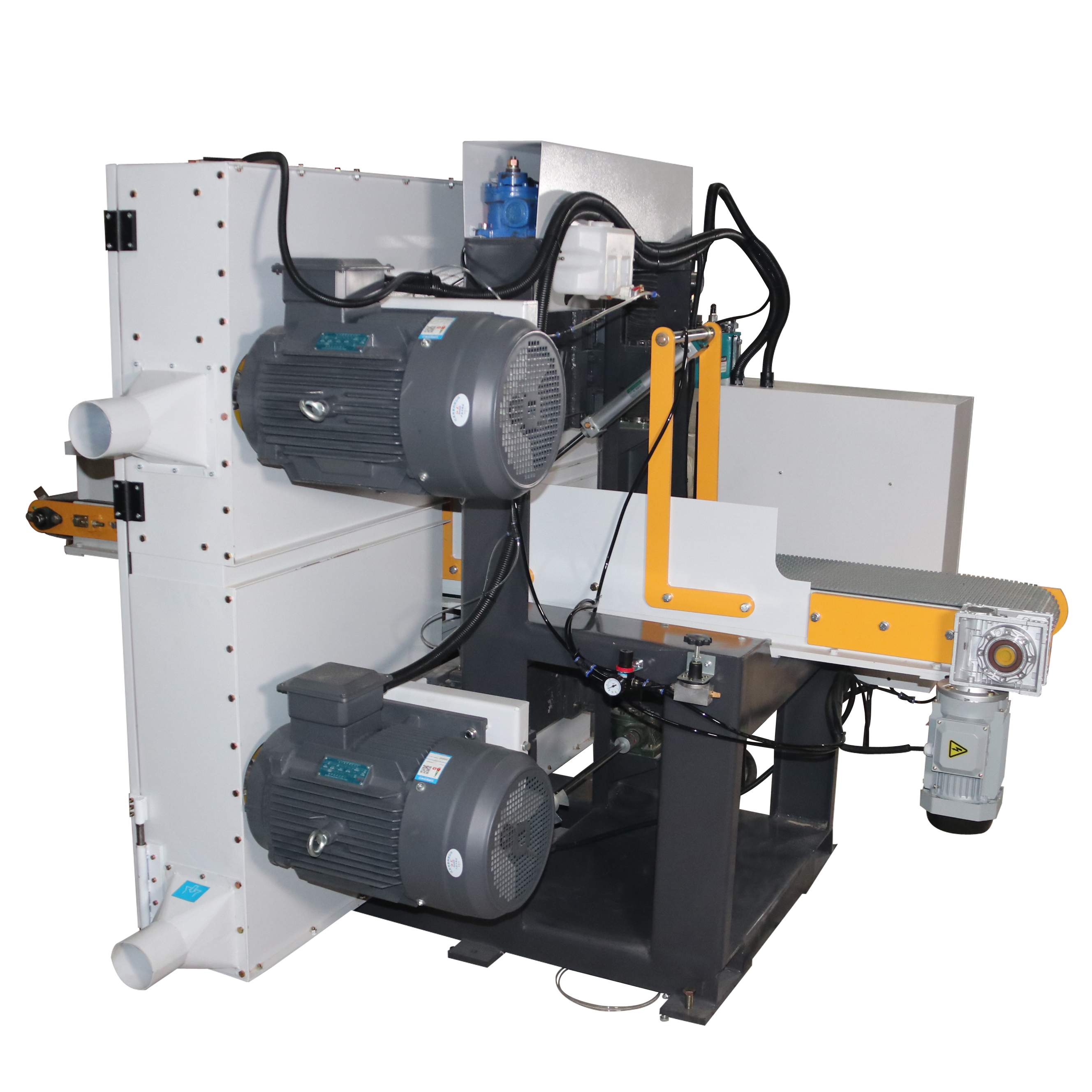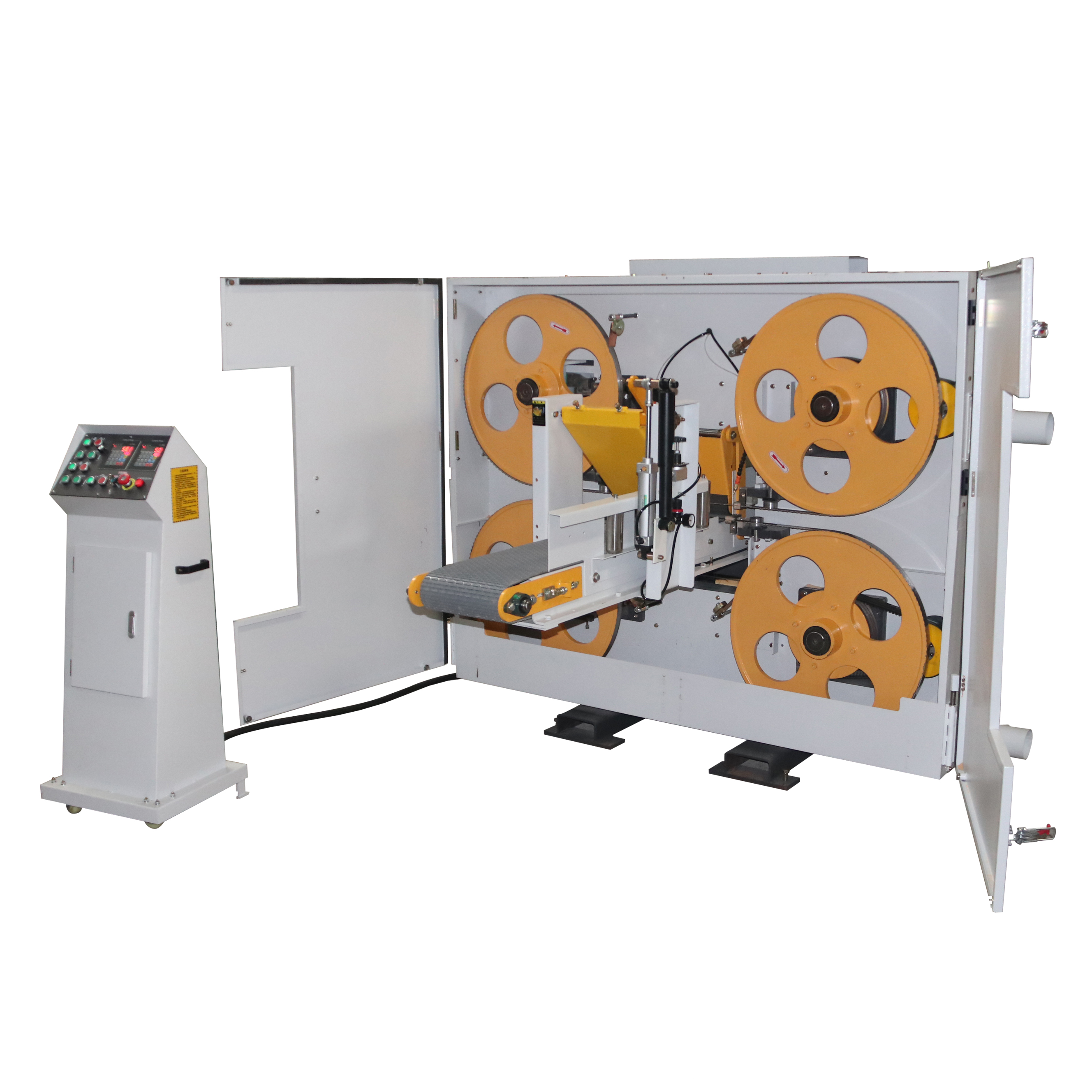 آلة منشار شريطي أفقي برأسين مزدوجين لأعلى ولأسفل لقطع الخشب مع وحدتي منشار